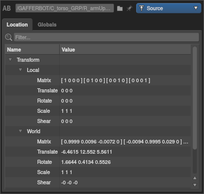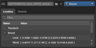 Each location has a number of properties that describe the content of the scene at that point in the hierarchy. They can be inspected in the Location tab of the Scene Inspector. Each property of each location is computed independently, allowing Gaffer to generate the scene lazily on demand.