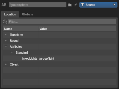 Once the Linked Lights plug is toggled on, the linkedLights attribute is added to the object’s location. The value of the Linked Lights plug is a set expression, which can consist of individual light locations, set names, or both. We will cover how to filter for both types below.