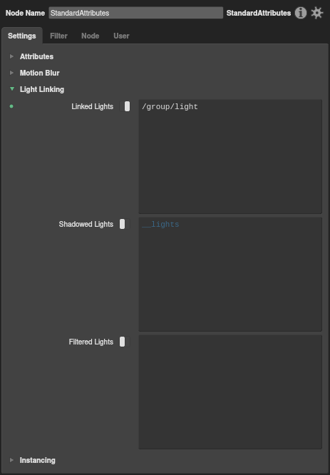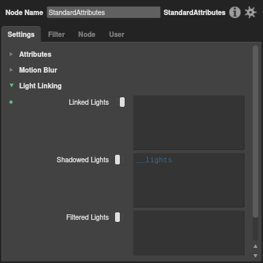 In a graph, in order to actually link a light to an object, you must connect a StandardAttributes node downstream of the object, filter for the object’s location, and then add a set expression to the Linked Lights plug.