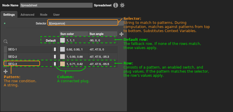 On a spreadsheet, each column drives a plug in the graph. Each row consists of a string pattern, an enabled switch, and a plug value per column. The selector is a string that is checked against each pattern. If the selector matches a pattern, the respective values in that pattern’s row apply to their connected plugs.