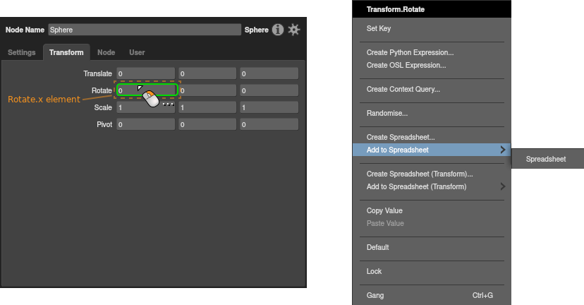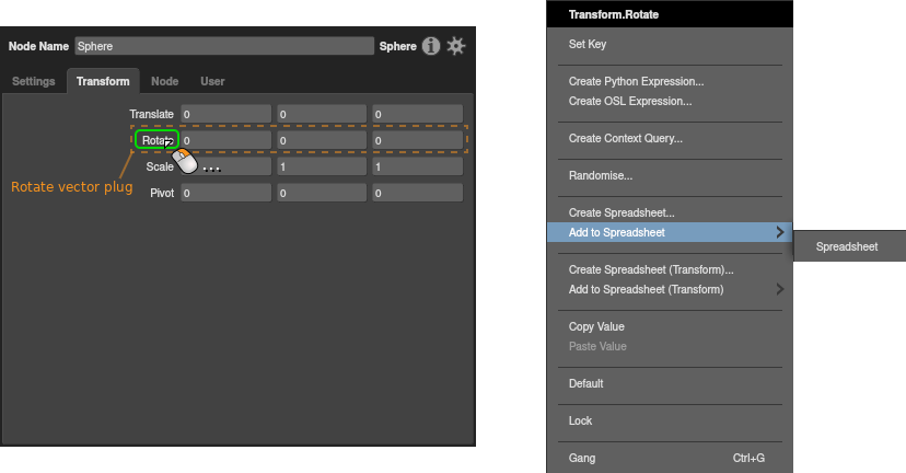 In a Node Editor, right-click the target plug, then select Create Spreadsheet… from the context menu.