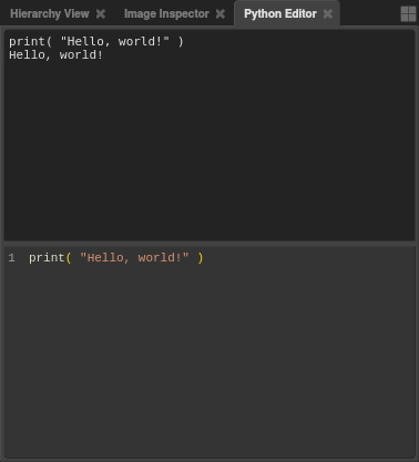 The Python Editor is a type of editor in the main Gaffer application that can execute arbitrary Python code with a built-in interpreter. It enables you to modify the node graph, try commands and syntax, and inspect data. In the default layout, it resides in the bottom-right panel, in a tab next to the Hierarchy View.