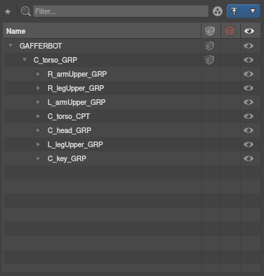 /group/GAFFERBOT/C_torso_GRP/C_head_GRP/C_head_CPT/*_ear*. The filter will now match the left and the right ears.