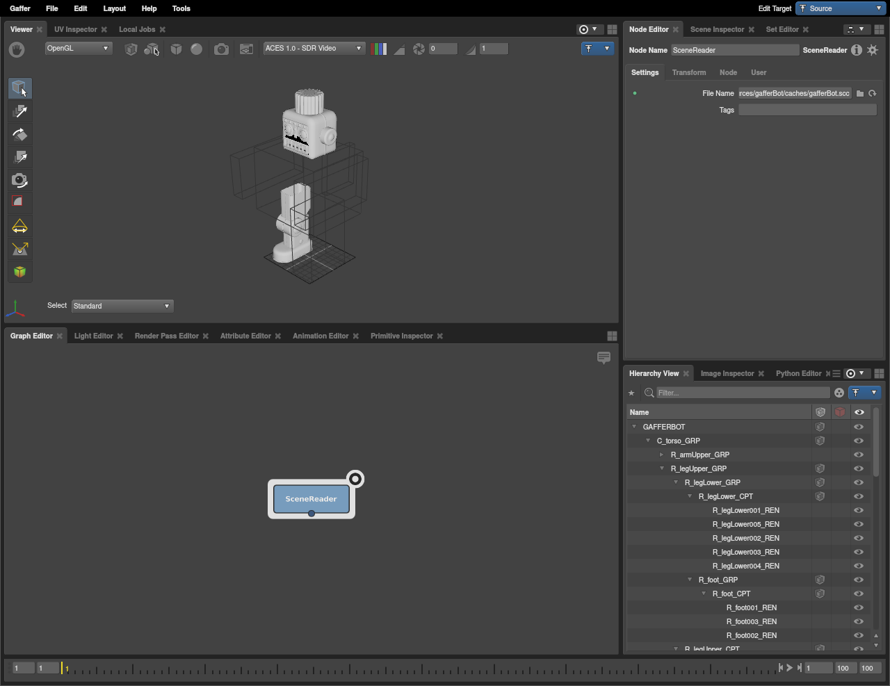 ${GAFFER_ROOT}/resources/gafferBot/caches/gafferBot.scc.Click the focus icon on the top right of the SceneReader to set it as the focus node, so that it will appear in editors set to follow focus, such as the viewer.