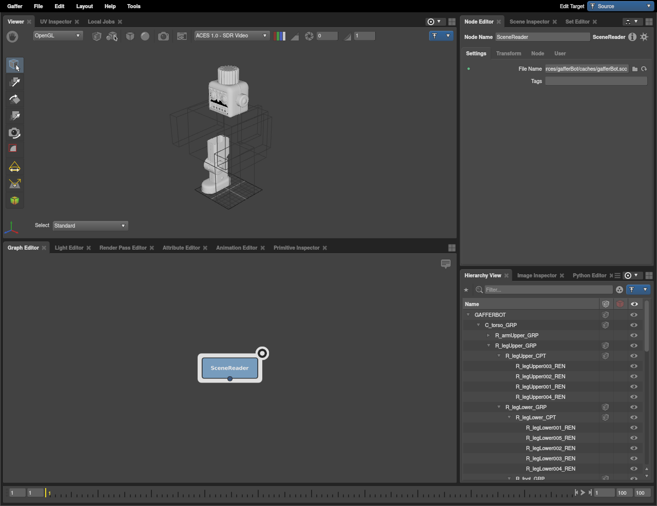 ${GAFFER_ROOT}/resources/gafferBot/caches/gafferBot.scc.Click the focus icon on the top right of the SceneReader to set it as the focus node, so that it will appear in editors set to follow focus, such as the viewer.